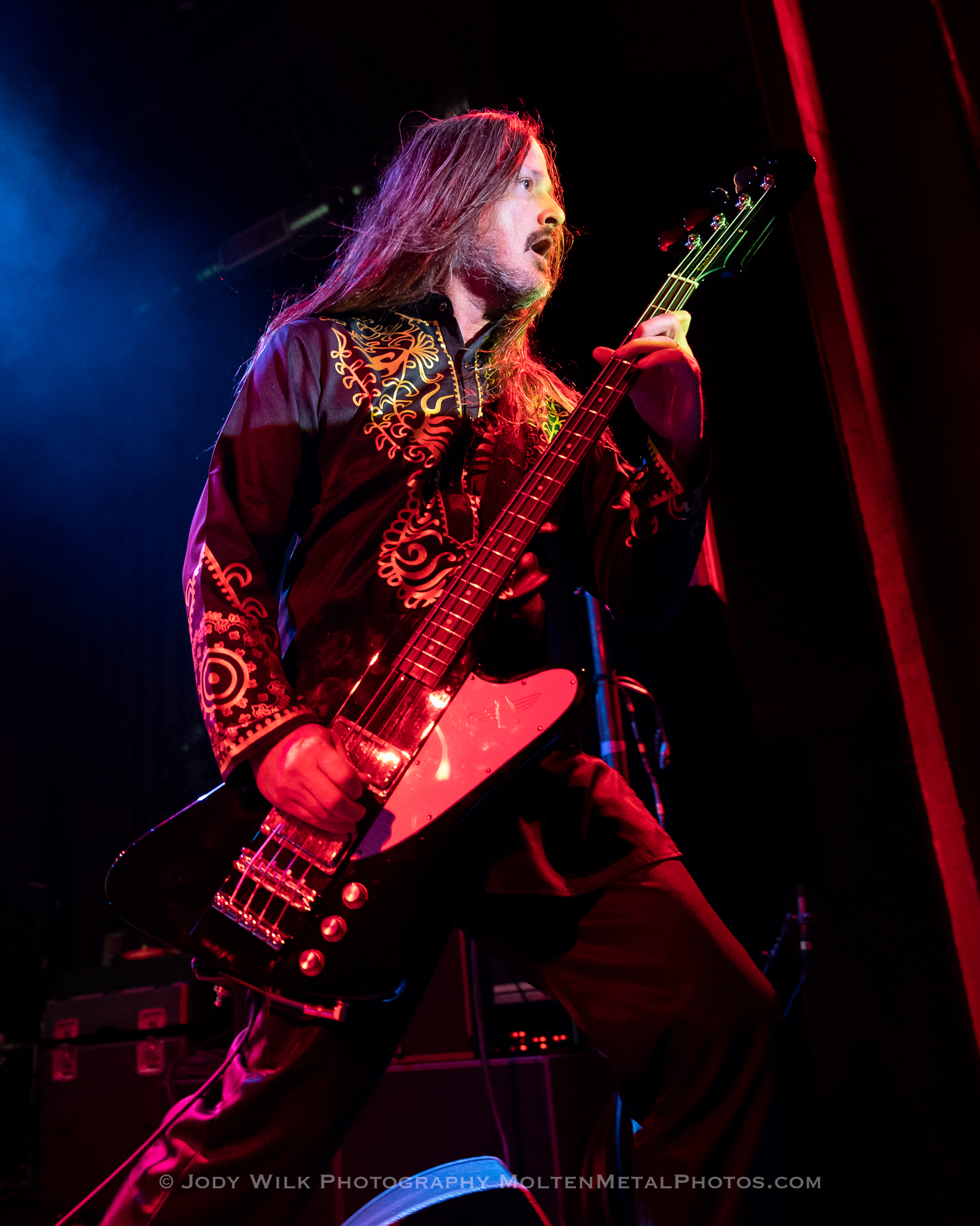 Headliners, Ministry followed. They came on stage with their backdrop stating “Ministry Stands With Ukraine“. Ministry performed behind a chain linked fence which heightened one’s view of the world’s current state of affairs. Founding member and vocalist, Al Jourgensen was completely captivating. His stage presence manifested a dynamic punch. His control over the room was astounding. Young and old headbanged to the exotic rhythms the band was emitting.